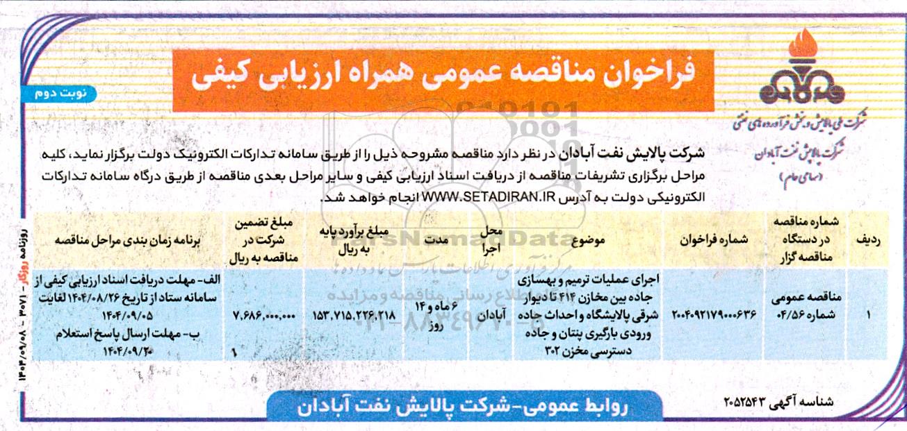 | 1 | مناقصه عمومی شماره 04.56 | 2004092179000636 | اجرای عملیات ترمیم و بهسازی جاده بین مخازن 414 تا دیوار شرقی پالایشگاه و احداث جاده ورودی بارگیری پنتان و جاده دسترسی مخازن 302 | آبادان | 6 ماه و 14 روز | 153.715.226.218 | 7.686.000.000 | الف- مهلت دریافت اسناد مناقصه از سامانه ستاد از تاریخ 1404.08.26 لغایت 1404.09.05 ب- مهلت ارسال پاسخ استعلام : مورخ 1404.09.20 |