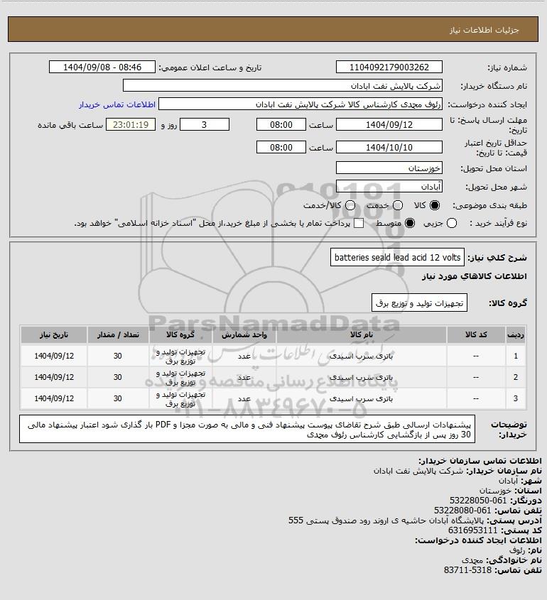 | 3 | -- | باتری سرب اسیدی | عدد | تجهیزات تولید و توزیع برق | 30 | 1404/09/12 |