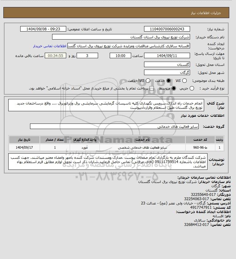 شرح کلی نیاز: انجام خدمات راه اندازی،سرویس نگهداری کلیه تاسیسات گرمایشی سرمایشی برق وژنراتوربرق ،... واقع درساختمان جدید توزیع برق گلستان طبق استعلام وقراردادپیوست