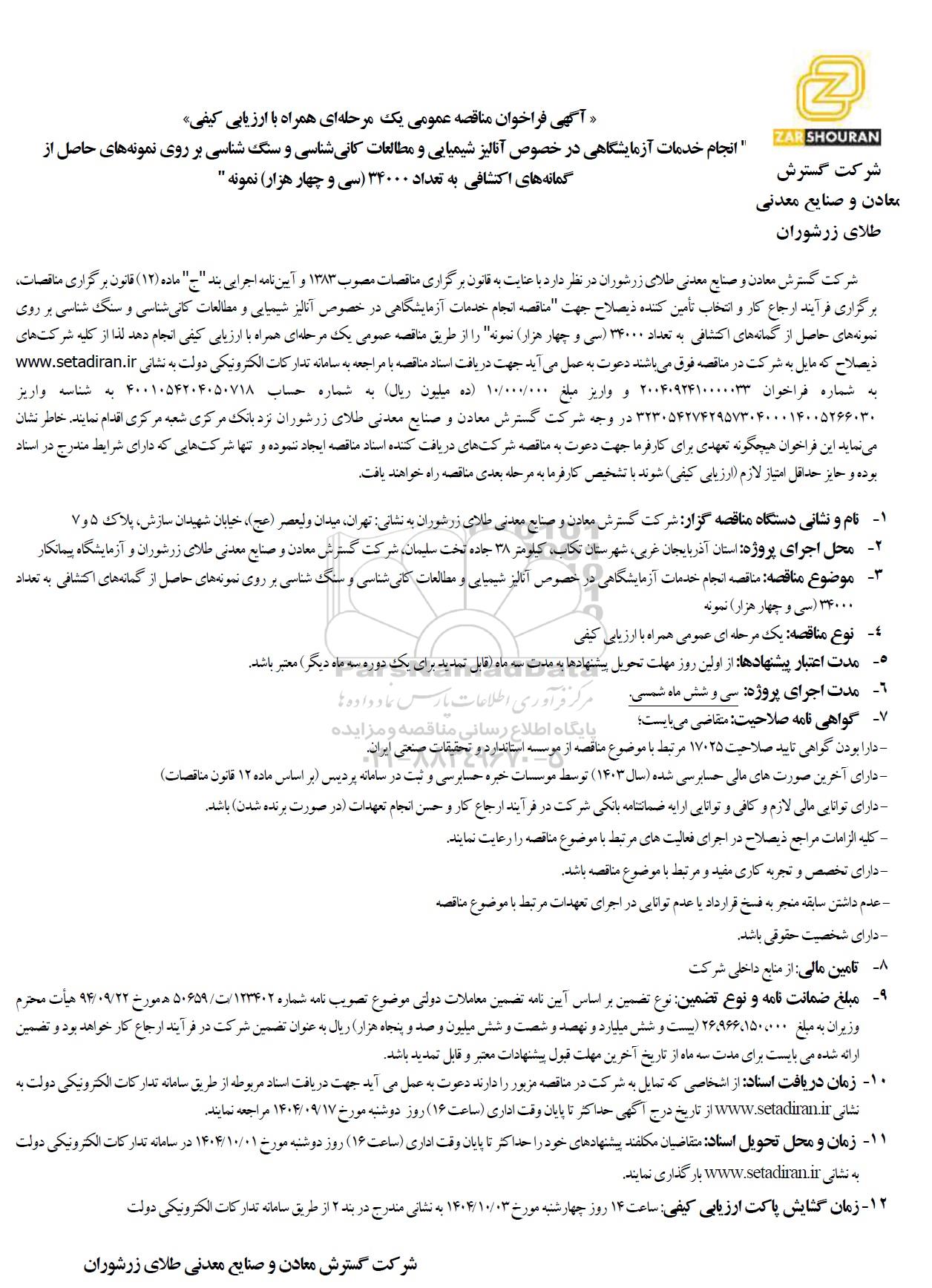 شرکت گسترش معادن و صنایع معدنی طلای زرشوران در نظر دارد با عنایت به قانون برگزاری مناقصات مصوب 1383 و آیین نامه اجرایی بند "ج" ماده (12) قانون برگزاری مناقصات، برگزاری فرآیند ارجاع کار و انتخاب تأمین کننده ذیصلاح جهت " مناقصه انجام خدمات آزمایشگاهی در خصوص آنالیز شیمیایی و مطالعات کانی شناسی و سنگ شناسی بر روی نمونه های حاصل از گمانه های اکتشافی به تعداد 34000 (سی و چهار هزار) نمونه " را از طریق مناقصه عمومی یک مرحله ای همراه با ارزیابی کیفی انجام دهد. لذا از کلیه شرکت های ذیصلاح که مایل به شرکت در مناقصه فوق می باشند دعوت به عمل می آید جهت دریافت اسناد مناقصه با مراجعه به سامانه تدارکات الکترونیکی دولت به نشانی (ستاد ایران) به شماره فراخوان 2004092410000033 و واریز مبلغ 10.000.000 (ده میلیون ریال) به شماره حساب 4001054204050718 به شناسه واریز 323054274295730400014005266030 در وجه شرکت گسترش معادن و صنایع معدنی طلای زرشوران نزد بانک مرکزی شعبه مرکزی اقدام نمایند. خاطر نشان می نماید این فراخوان هیچ گونه تعهدی برای کارفرما جهت دعوت به مناقصه شرکت های دریافت کننده اسناد مناقصه ایجاد ننموده و تنها شرکت هایی که دارای شرایط مندرج در اسناد بوده و حایز حداقل امتیاز لازم (ارزیابی کیفی) شوند با تشخیص کارفرما به مرحله بعدی مناقصه راه خواهند یافت.