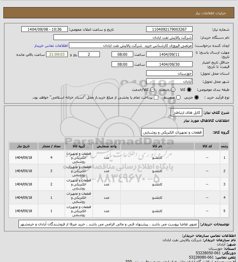 | 1 | -- | کابلشو | عدد | قطعات و تجهیزات الکتریکی و روشنایی | 4 | 1404/09/18 |