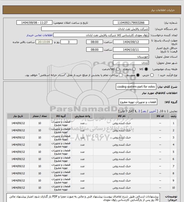 شرح کلی نیاز: cooling system part for volvo