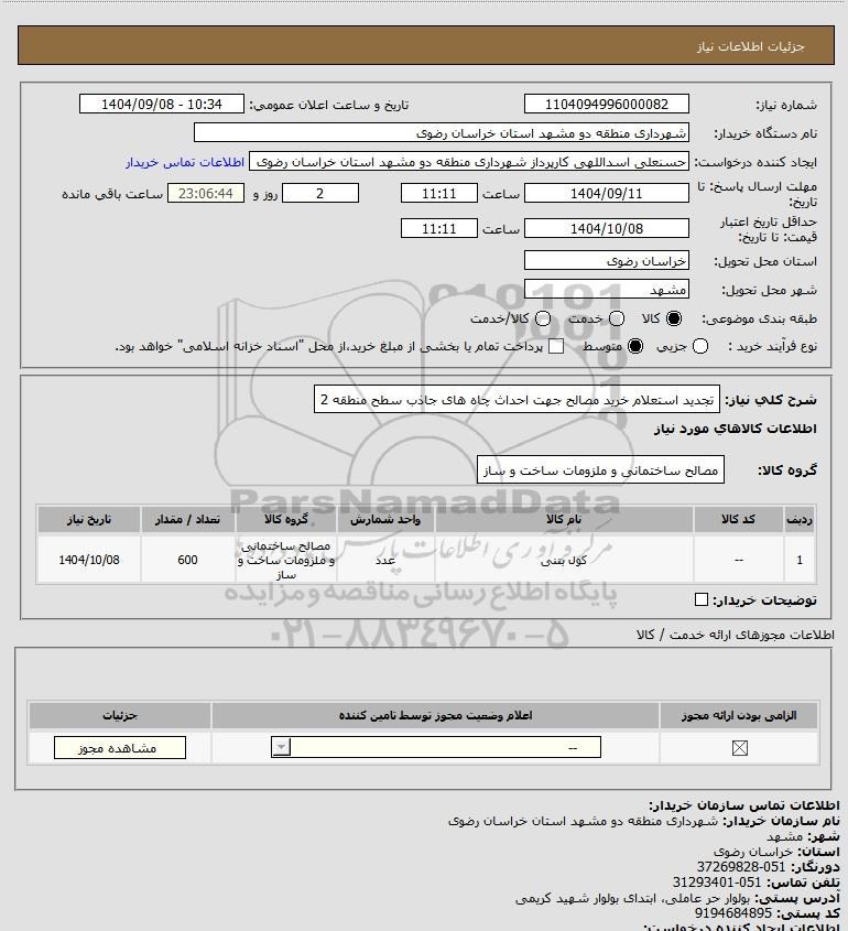 شرح کلی نیاز: تجدید استعلام خرید مصالح جهت احداث چاه های جاذب سطح منطقه 2