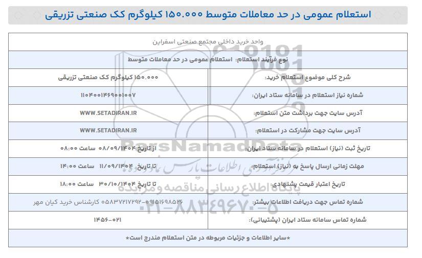 استعلام عمومی در حد معاملات متوسط 150.000 کیلوگرم کک صنعتی تزریقی