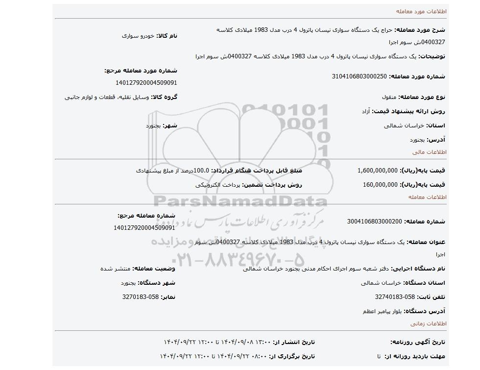 | عنوان معامله: یک دستگاه سواری نیسان پاترول 4 درب مدل 1983 میلادی کلاسه 0400327ش سوم اجرا | ||
