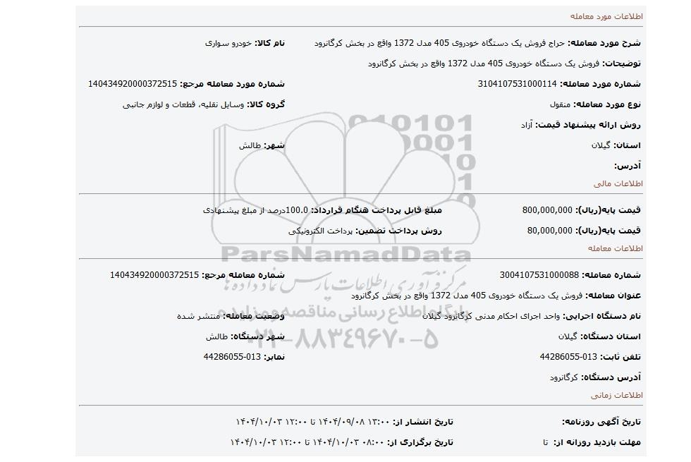 | شرح مورد معامله: حراج فروش یک دستگاه خودروی 405 مدل 1372 واقع در بخش کرگانرود | نام کالا: خودرو سواری | |
