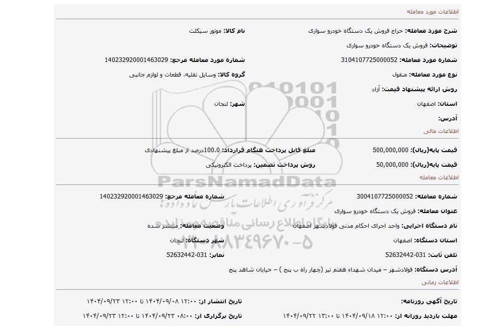 | شرح مورد معامله: حراج فروش یک دستگاه خودرو سواری | نام کالا: موتور سیکلت | |