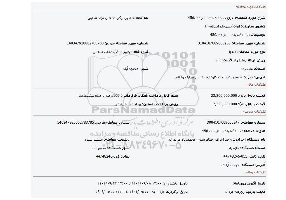 | عنوان معامله: دستگاه پلت ساز مدل 450 | ||