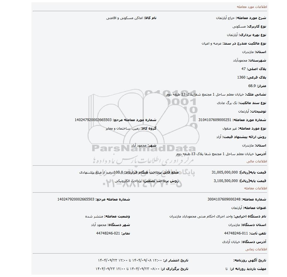 | شماره مورد معامله: 3104107609000251 | شماره مورد معامله مرجع: 140247920002665503 | |
