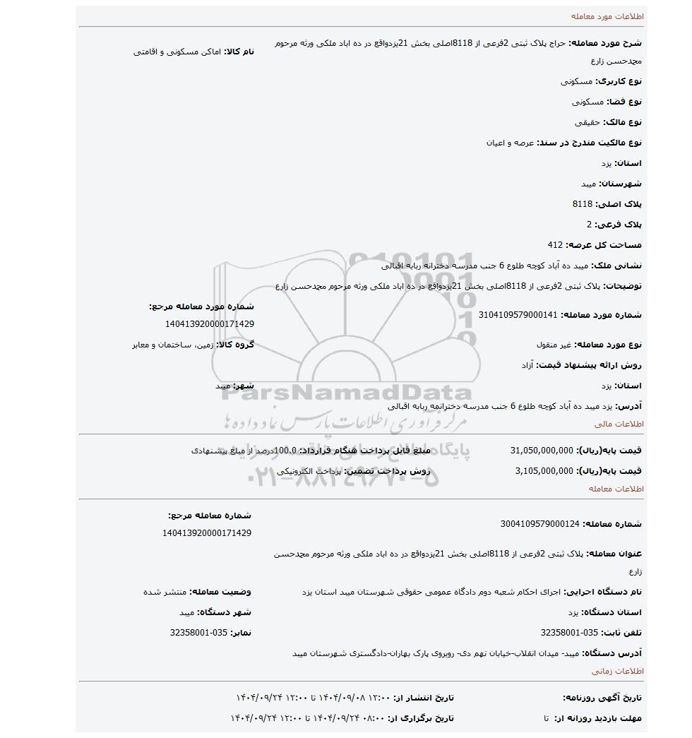 | شرح مورد معامله: حراج پلاک ثبتی 2فرعی از 8118اصلی بخش 21یزدواقع در ده اباد ملکی ورثه مرحوم محمدحسن زارع | نام کالا: اماکن مسکونی و اقامتی | |