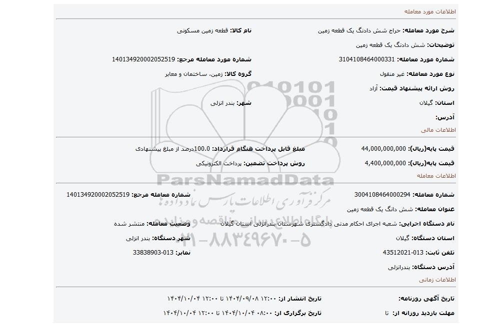 مزایده عمومی مزایده شش دادنگ یک قطعه زمین برگزار میگردد. از کلیه افراد متخصص و شرکت‌های واجد شرایط دعوت به عمل می‌آید تا در این مزایده با کد خبرگزاری پارس نماد : 9916753 شرکت نمایند تاریخ شروع مزایده : 1404/09/08 مهلت شرکت در مزایده: تا پایان روز 1404/10/04 مکان برگزاری اموال واگذاری استان‌های مزایدات استان گیلان و دسته‌بندی‌های مربوط به این حراجی املاک و زمین میباشد.