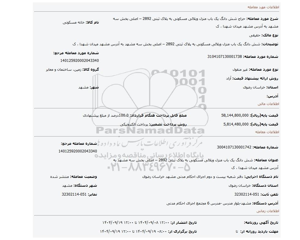 | شرح مورد معامله: حراج شش دانگ یک باب منزل ویلائی مسکونی به پلاک ثبتی 2892 – اصلی بخش سه مشهد به آدرس مشهد میدان شهدا ، ک | نام کالا: خانه مسکونی | |