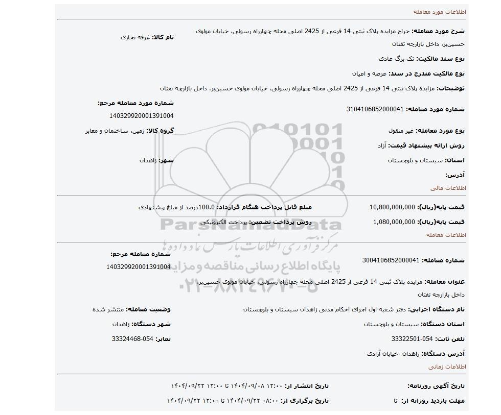 | عنوان معامله: مزایده پلاک ثبتی 14 فرعی از 2425 اصلی محله چهارراه رسولی، خیابان مولوی حسین بر، داخل بازارچه تفتان | ||