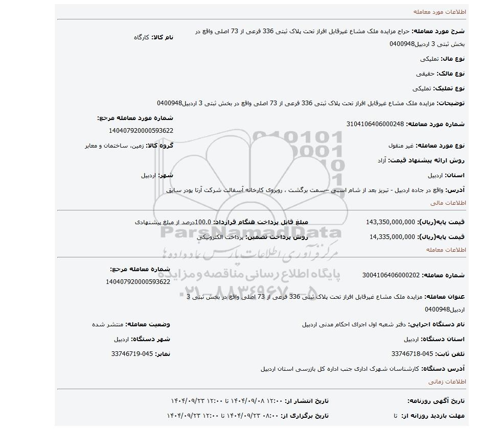 | عنوان معامله: مزایده ملک مشاع غیرقابل افراز تحت پلاک ثبتی 336 فرعی از 73 اصلی واقع در بخش ثبتی 3 اردبیل0400948 | ||
