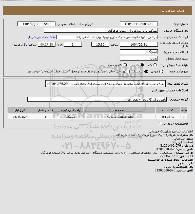 شرح کلی نیاز: تهیه و نصب شبکه فشار متوسط جهت توسعه فیدر پست فوق توزیع جغین - 13,064,376,294