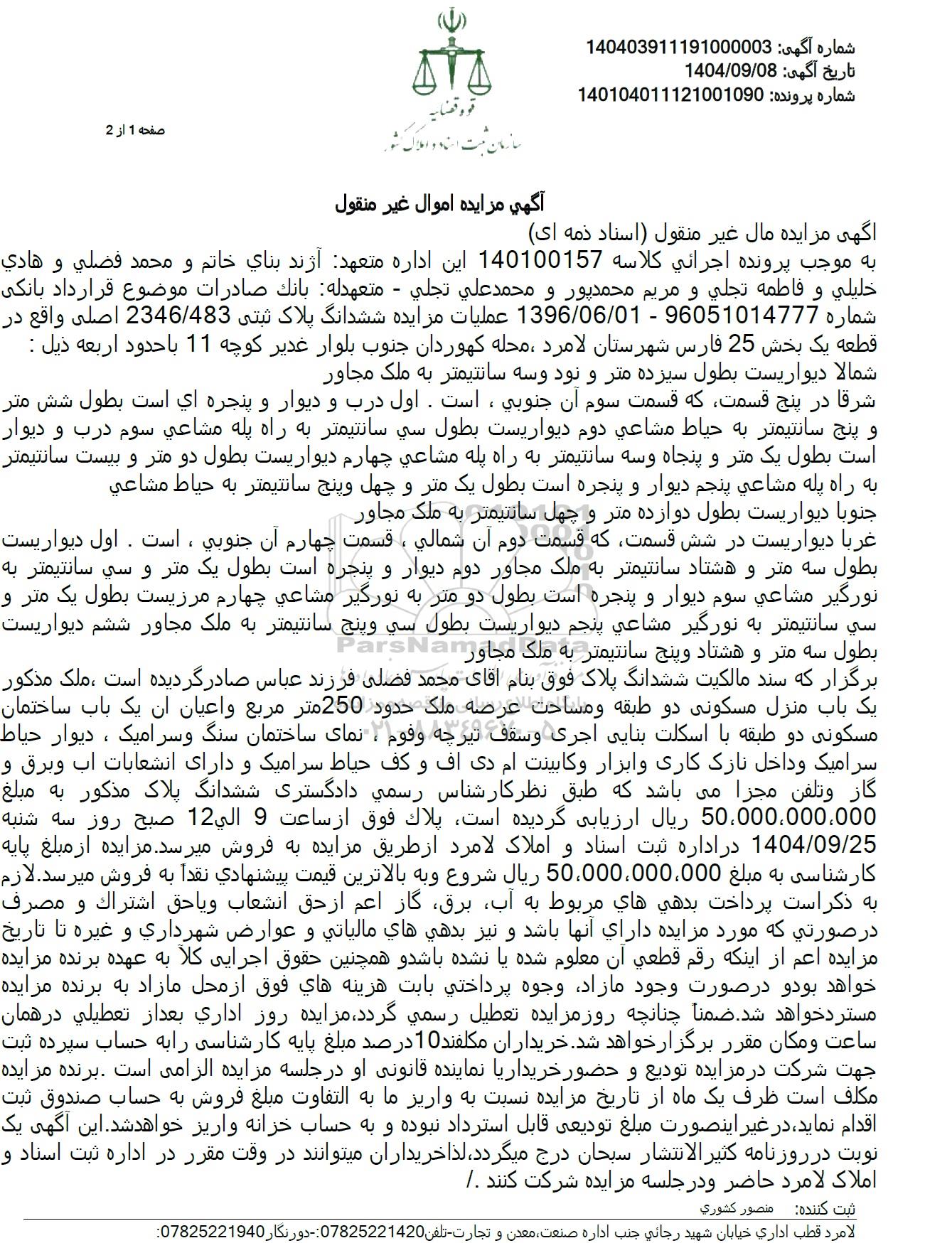 به موجب پرونده اجرائی کلاسه 140100157 این اداره متعهد آژند بنای خاتم و محمد فضلی و هادی خلیلی و فاطمه تجلی و مریم محمدپور و محمد علی تجلی - متعهدله بانک صادرات موضوع قرارداد بانکی شماره 96051014777 - 1396.06.01 عملیات مزایده ششدانگ پلاک ثبتی 2346.483 اصلی واقع در قطعه یک بخش 25 فارس شهرستان لامرد ، محله کهوردان جنوب بلوار غدیر کوچه 11 با حدود اربعه ذیل : شمالا دیواریست بطول سیزده متر و نود و سه سانتیمتر به ملک مجاور