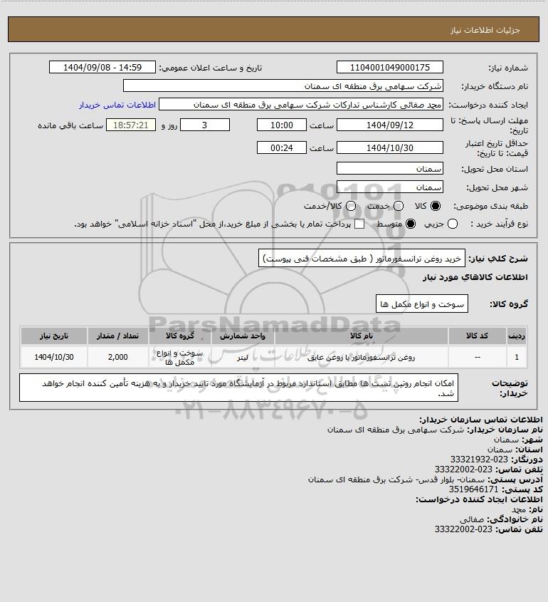 شرح کلی نیاز: خرید روغن ترانسفورماتور ( طبق مشخصات فنی پیوست)