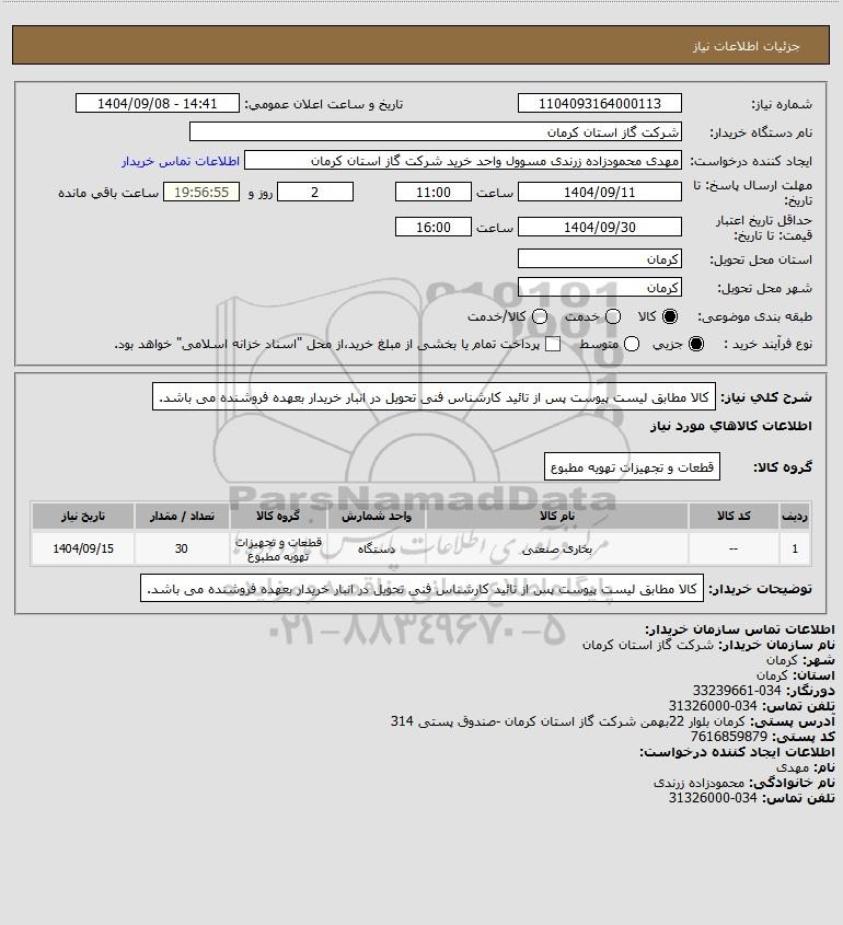 نام دستگاه خریدار:شرکت گاز استان کرمان