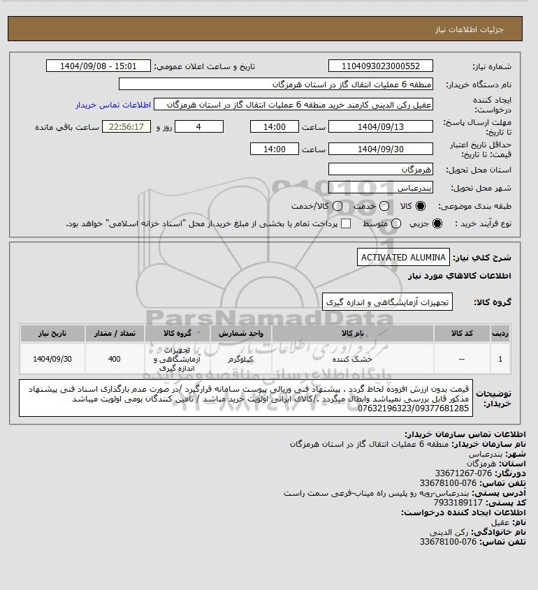 شرح کلی نیاز: ACTIVATED ALUMINA