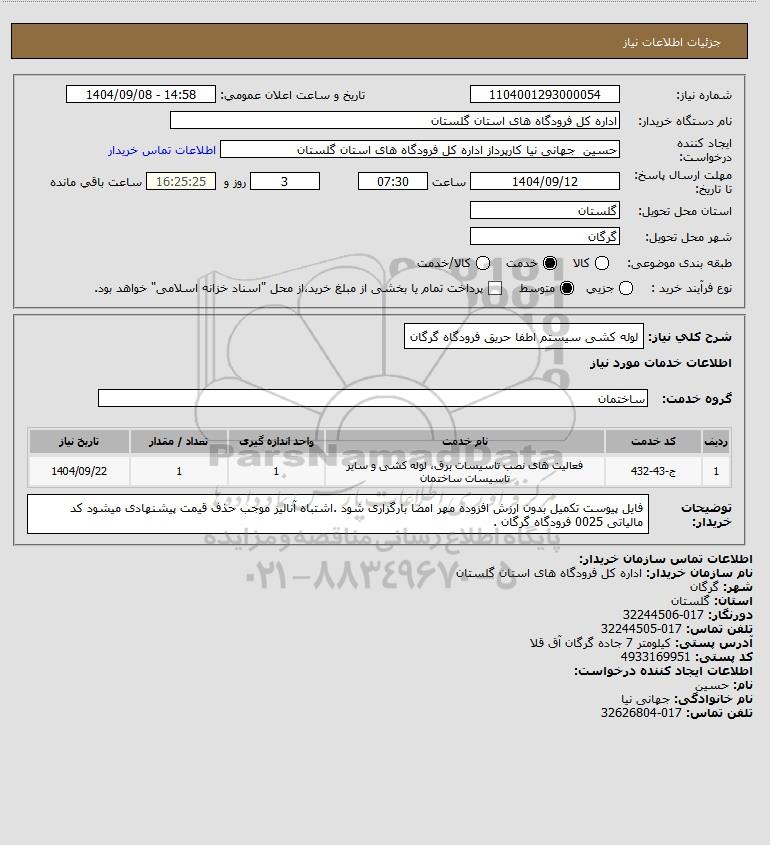 شرح کلی نیاز: لوله کشی سیستم اطفا حریق فرودگاه گرگان