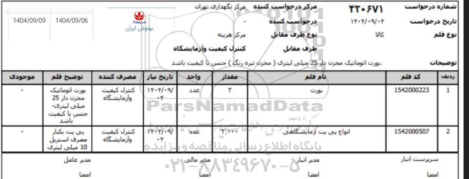 ردیف کد قلم نام قلم مقدار واحد تاریخ نیاز مصرف کننده توضیح قلم موجودی
