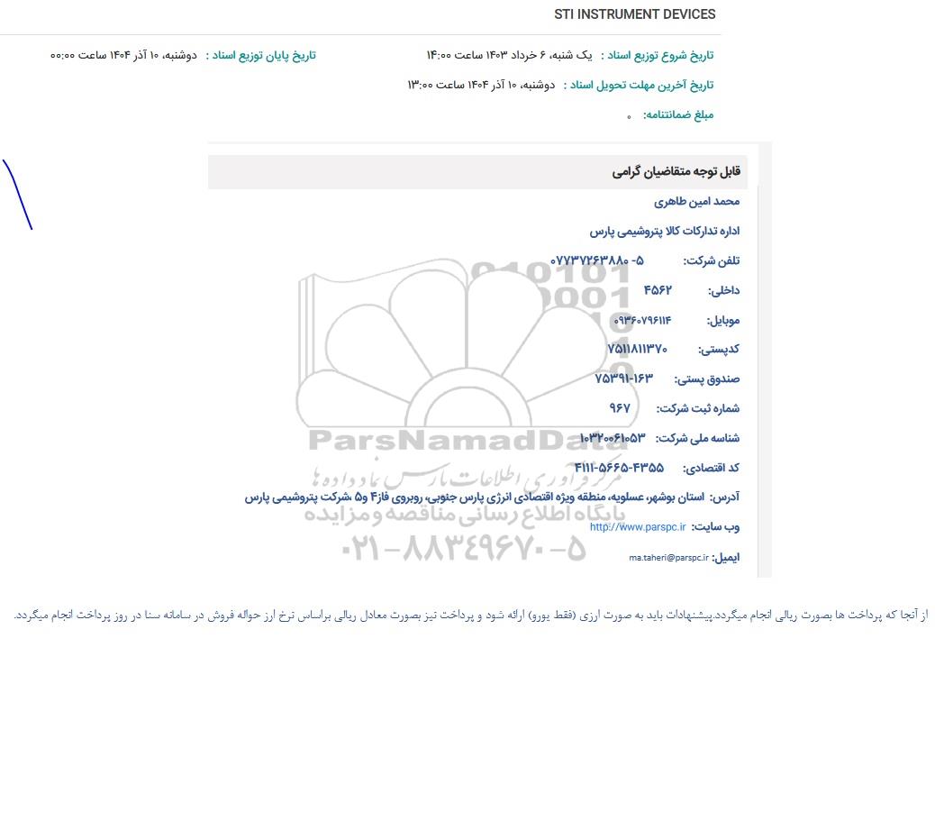 استعلام بها و موضوع استعلام استعلام STI INSTRUMENT DEVICES به اطلاع کلیه شرکتها و افراد متخصص واجد شرایط میرساند، آگهی گذار در نظر دارد از طریق استعلام بها، نسبت به انتخاب و دریافت پیشنهادات اقدام نماید. این استعلام با کد آگهی ثبت شده در سامانه خبرگزاری پارس نماد : 9916965 منتشر شده است. مشخصات استعلام : تاریخ شروع استعلام: 1404/09/08 آخرین مهلت ارسال پیشنهاد قیمت : 1404/09/10 و محل اجرای پروژه : استان مناقصات استان بوشهر میباشد. استعلام قیمت مورد درخواست : استعلام STI INSTRUMENT DEVICES با دستهبندیهای تخصصی و گروه های مرتبط : ابزار دقیق, تجهیزات نفت و گاز, استعلام اطلاع رسانی میگردد.