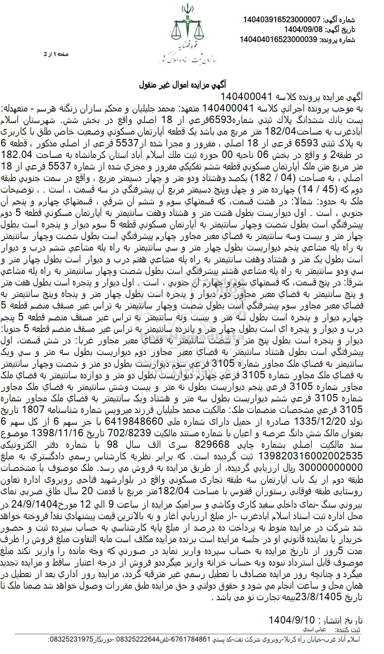 به موجب پرونده اجرائی کلاسه 140400041 متعهد محمد جلیلیان و محکم سازان زنگنه هرسم - متعهدله پست بانک ششدانگ پلاك ثبتی شماره 6593 فرعی از 18 اصلی واقع در بخش شش شهرستان اسلام آباد غرب به مساحت 182.04 متر مربع می باشد یک قطعه آپارتمان مسكونی وضعیت خاص طلق با کاربری به پلاک ثبتی 6593 فرعی از 18 اصلی ، مفروز و مجزا شده از 5537 فرعی از اصلی مذکور ، قطعه 6 در طبقه 2 و واقع در بخش 06 ناحیه 00 حوزه ثبت ملك اسلام آباد استان کرمانشاه به مساحت 182.04 متر مربع متن ملک آپارتمان مسکونی قطعه ششم تفکیکی مفروز و مجزی شده از شماره 5537 فرعی از 18 اصلی ، به مساحت (04 . 182) یكصد و هشتاد و دو متر و چهار دسیمتر مربع ، واقع در سمت جنوبی طبقه دوم که (45 . 14) چهارده متر و چهل و پنج دسیمتر مربع آن پیشرفتگی در سه قسمت ، است . ، توضیحات ملک به حدود شمالا در هشت قسمت که قسمتهای سوم و ششم آن شرقی ، قسمتهای چهارم و پنجم آن جنوبی ، است . اول دیواریست بطول هشت متر و هشتاد و هفت سانتیمتر به آپارتمان مسكونی قطعه 5 دوم پیشرفتگی است بطول شصت و چهار سانتیمتر به آپارتمان مسکونی قطعه 5 سوم دیوار و پنجره است بطول چهار متر و بیست و سه سانتیمتر به فضای معبر مجاور چهارم پیشرفتگی است بطول شصت و چهار سانتیمتر به راه پله مشاعی پنجم دیواریست بطول چهار متر و سی سانتیمتر به راه پله مشاعی ششم درب و دیوار است بطول یک متر و هشتاد و هفت سانتیمتر به راه پله مشاعی هفتم درب و دیوار است بطول چهار متر و سی و دو سانتیمتر به راه پله مشاعی هشتم پیشرفتگی است بطول شصت و چهار سانتیمتر به راه پله مشاعی شرقا در پنج قسمت که قسمتهای سوم و چهارم آن جنوبی ، است. اول دیوار و پنجره است بطول هفت متر و پنج سانتیمتر به فضای معبر مجاور دوم دیوار و پنجره است بطول چهار متر و پنجاه و پنج سانتیمتر به فضای معبر مجاور سوم پیشرفتگی است بطول شصت و چهار سانتیمتر به تراس غیر مسقف منضم قطعه 5 چهارم دیوار و پنجره است بطول سه متر و بیست و نه سانتیمتر به تراس غیر مسقف منضم قطعه 5 پنجم درب و دیوار و پنجره ای است بطول چهار متر و پانزده سانتیمتر به تراس غیر مسقف منضم قطعه 5 جنوبا دیوار و پنجره است بطول پنج متر و شصت سانتیمتر به فضای معبر مجاور غربا در شش قسمت اول پیشرفتگی است بطول هشتاد سانتیمتر به فضای معبر مجاور دوم دیواریست بطول سه متر و سی و یک سانتیمتر به فضای ملک مجاور شماره 3105 فرعی سوم دیواریست بطول دو متر و شصت و چهار سانتیمتر به فضای ملک مجاور شماره 3105 فرعی چهارم دیواریست بطول دو متر و دوازده سانتیمتر به فضای ملک مجاور شماره 3105 فرعی پنجم دیواریست بطول نه متر و بیست و شش سانتیمتر به فضای ملک مجاور شماره 3105 فرعی ششم دیواریست بطول سه متر و هشتاد و یک سانتیمتر به فضای ملک مجاور شماره 3105 فرعی مشخصات منضمات ملک مالکیت محمد جلیلیان فرزند میرویس شماره شناسنامه 1807 تاریخ تولد 1335.12.20 صادره از حمیل دارای شماره ملی 6419848660 با جز سهم 6 از کل سهم 6 بعنوان مالک شش دانگ عرصه و اعیان با شماره مستند مالکیت 702.8239 تاریخ 1398.11.16 موضوع سند مالكیت اصلی بشماره چاپی 829668 سری الف سال 98 با شماره دفتر الکترونیکی 139820316002002535 ثبت گردیده است که برابر نظریه کارشناس رسمی دادگستری به مبلغ 30000000000 ریال ارزیابی گردیده از طریق مزایده به فروش میرسد ملک موصوف با مشخصات طبقه دوم از یک باب آپارتمان سه طبقه تجاری مسکونی واقع در بلوار شهید فتاحی روبروی اداره تعاون روستایی طبقه فوقانی رستوران ققنوس با مساحت 182.04 متر مربع با قدمت 20 سال طاق ضربی نمای بیرونی سنگ نمای داخلی سفید کاری و کاشی و سرامیک مزایده از ساعت 9 الی 12 مورخ 24.9.1404 در محل اداره ثبت اسناد اسلام آباد غرب از مبلغ ارزیابی آغاز و به بالاترین قیمت پیشنهادی نقدا فروخته خواهد شد شرکت در مزایده منوط به پرداخت ده درصد از مبلغ پایه کارشناسی به حساب سپرده ثبت و حضور خریدار یا نماینده قانونی او در جلسه مزایده است برنده مزایده مکلف است ما به التفاوت مبلغ فروش را ظرف مدت 5 روز از تاریخ مزایده به حساب سپرده واریز نماید در صور