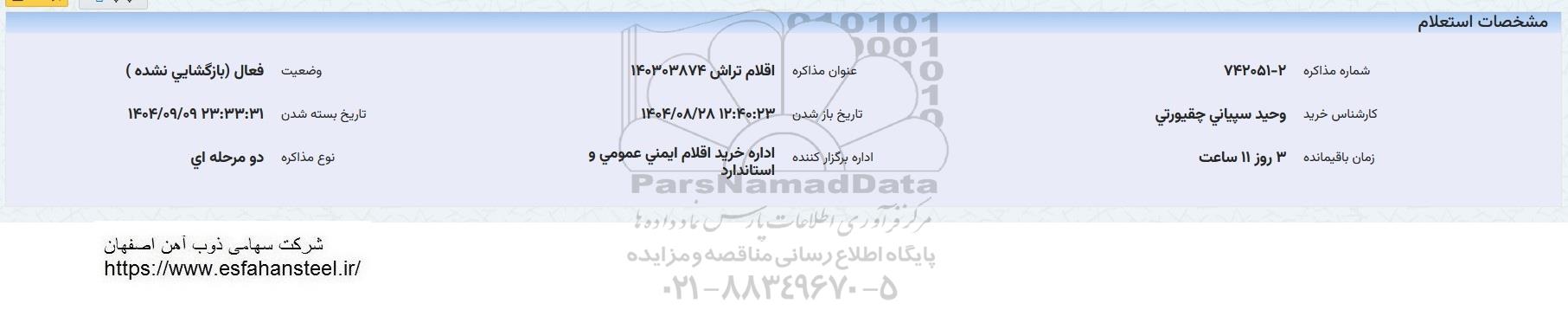 استعلام بها و موضوع استعلام استعلام اقلام تراش به اطلاع کلیه شرکت‌ها و افراد متخصص واجد شرایط می‌رساند، آگهی گذار در نظر دارد از طریق استعلام بها، نسبت به انتخاب و دریافت پیشنهادات اقدام نماید. این استعلام با کد آگهی ثبت شده در سامانه خبرگزاری پارس نماد : 9916969 منتشر شده است. مشخصات استعلام : تاریخ شروع استعلام: 1404/09/08 آخرین مهلت ارسال پیشنهاد قیمت : 1404/09/09 و محل اجرای پروژه : استان مناقصات استان سایر میباشد. استعلام قیمت مورد درخواست : استعلام اقلام تراش با دسته‌بندی‌های تخصصی و گروه های مرتبط : دستگاه تراش, ساخت،نصب و تعمیرات صنایع فولاد, تجهیزات و ماشین آلات صنعتی, استعلام اطلاع رسانی میگردد.