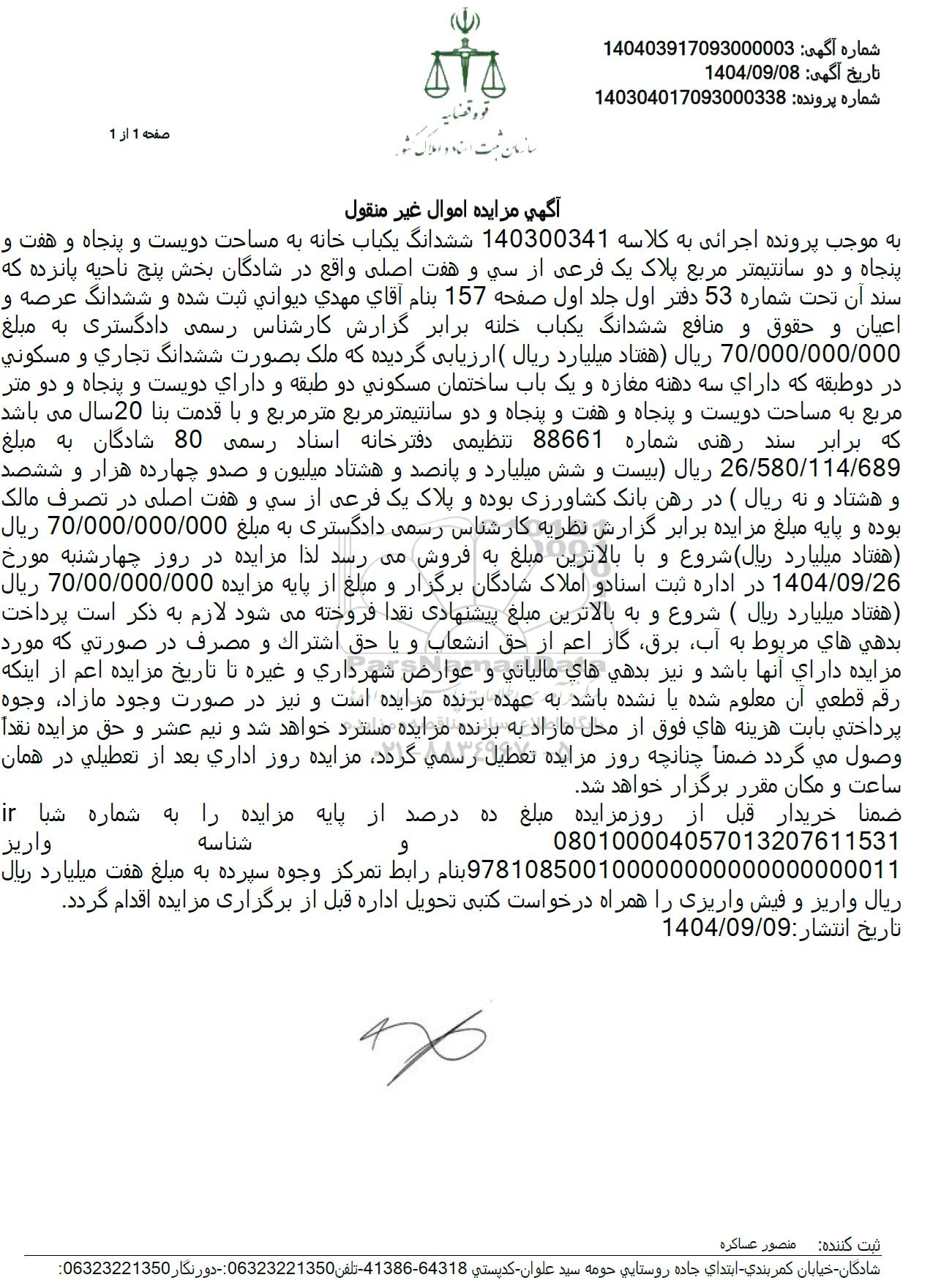 به موجب پرونده اجرانی به کلاسه 140300341 ششدانگ یکباب خانه به مساحت دویست و پنجاه و هفت و پنجاه و دو سانتیمتر مربع پلاک یک فرعی از سی و هفت اصلی واقع در شادگان بخش پنج ناحیه پانزده که سند آن تحت شماره 53 دفتر اول جلد اول صفحه 157 بنام آقای مهدی دیوانی ثبت شده و ششدانگ عرصه و اعیان و حقوق و منافع ششدانگ یکباب خانه برابر گزارش کارشناس رسمی دادگستری به مبلغ 70.000.000.000 ریال هفتاد میلیارد ریال ارزیابی گردیده که ملک بصورت ششدانگ تجاری و مسکونی در دو طبقه که دارای سه دهنه مغازه و یک باب ساختمان مسکونی دو طبقه و دارای دویست و پنجاه و دو متر مربع به مساحت دویست و پنجاه و هفت و پنجاه و دو سانتیمتر مربع متر مربع و با قدمت بنا 20 سال می باشد. که برابر سند رهنی شماره 88661 تنظیمی دفترخانه اسناد رسمی 80 شادگان به مبلغ 26.580.114.689 ریال بیست و شش میلیارد و پانصد و هشتاد میلیون و صدو چهارده هزار و ششصد و هشتاد و نه ریال در رهن بانک کشاورزی بوده و پلاک یک فرعی از سی و هفت اصلی در تصرف مالک بوده و پایه مبلغ مزایده برابر گزارش نظریه کارشناس رسمی دادگستری به مبلغ 70.000.000.000 ریال هفتاد میلیارد ریال شروع و با بالاترین مبلغ به فروش میرسد لذا مزایده در روز چهارشنبه مورخ 1404.09.26 در اداره ثبت اسناد و املاک شادگان برگزار و مبلغ از پایه مزایده 70.00.000.000 ریال هفتاد میلیارد ریال شروع و به بالاترین مبلغ پیشنهادی نقدا فروخته میشود لازم به ذکر است پرداخت بدهی های مربوط به آب برق گاز اعم از حق انشعاب و یا حق اشتراک و مصرف در صورتی که مورد مزایده دارای آنها باشد و نیز بدهی های مالیاتی و عوارض شهرداری و غیره تا تاریخ مزایده اعم از اینکه رقم قطعی آن معلوم شده یا نشده باشد به عهده برنده مزایده است و نیز در صورت وجود مازاد، وجوه پرداختی بابت هزینه های فوق از محل مازاد به برنده مزایده مسترد خواهد شد و نیم عشر و حق مزایده نقدا وصول میگردد ضمنا چنانچه روز مزایده تعطیل رسمی گردد مزایده روز اداری بعد از تعطیلی در همان ساعت و مکان مقرر برگزار خواهد شد.