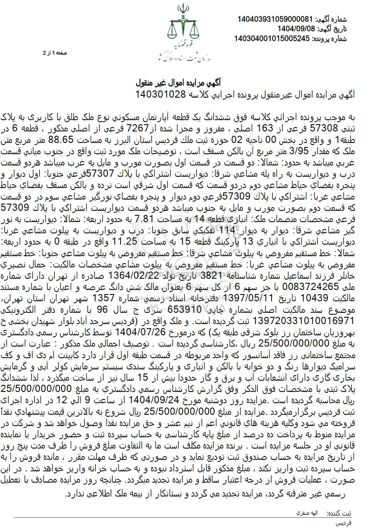 به موجب پرونده اجرانی کلاسه فوق ششدانگ یک قطعه آپارتمان مسکونی نوع ملک طلق با کاربری به پلاک ثبتی 57308 فرعی از 163 اصلی، مفروز و مجزا شده از 7267 فرعی از اصلی مذکور ، قطعه 6 در طبقه 1 و واقع در بخش 00 ناحیه 02 حوزه ثبت ملک فردیس استان البرز به مساحت 88.65 متر مربع متن ملک که مقدار 3/95 متر مربع آن بالکن مسقف است، توضیحات ملک مورد ثبت واقع در جنوب میانی قسمت غربی میباشد به حدود شمالا دو قسمت در قسمت اول بصورت مورب و مایل به غرب میباشد هر دو قسمت درب و دیواریست به راه پله مشاعی شرقا دیواریست اشتراکی با پلاک 57307 فرعی جنوبا اول دیوار و پنجره بفضای حیاط مشاعی دوم در دو قسمت که قسمت اول شرقی است نرده و بالکن مسقف بفضای حیاط مشاعی غربا اشتراکی با با پلاک 57309 فرعی دوم دیوار و پنجره بفضای نورگیر مشاعی سوم در دو قسمت که قسمت دوم بصورت مورب و مایل به جنوب میباشد هر دو قسمت دیواریست اشتراکی با پلاک 57309 فرعی مشخصات منضمات ملک انباری قطعه 14 به مساحت 7.81 به حدود اربعه شمالا دیواریست به نور گیر مشاعی شرقا دیوار به دیوار 114 تفکیکی سابق جنوبا درب و دیواریست به پیلوت مشاعی غربا دیواریست اشتراکی با انباری 13 پارکینگ قطعه 15 به مساحت 11.25 واقع در طبقه 0 به حدود اربعه شمالا خط مستقیم مفروض به پیلوت مشاعی شرقا خط مستقیم مفروض به پیلوت مشاعی جنوبا خط مستقیم مفروض به پیلوت مشاعی غربا خط مستقیم مفروض به پیلوت مشاعی مشخصات مالکیت: جمال نصیری خانلر فرزند اسماعیل شماره شناسنامه 3821 تاریخ تولد 1364/02/22 صادره از تهران دارای شماره ملی 0083724265 با جز سهم 6 از کل سهم 6 بعنوان مالک شش دانگ عرصه و اعیان با شماره مستند مالکیت 10439 تاریخ 1397.05.11 دفترخانه اسناد رسمی شماره 1357 شهر تهران استان تهران موضوع سند مالکیت اصلی بشماره چاپی 653910 سری ج سال 96 با شماره دفتر الکترونیکی 139720331010016971 ثبت گردیده است و ملک واقع در فردیس سرحد آباد بلوار شهیدان بخشی خ بهروزیان ساختمان رز بلوک شرقی طبقه یک که در مورخ 1404.07.26 توسط کارشناس رسمی دادگستری به مبلغ 25.500.000.000 ریال ، کارشناسی گردیده است. توصیف اجمالی ملک مذکور : عبارت است از مجتمع ساختمانی رز فاقد آسانسور که واحد مربوطه در قسمت طبقه اول قرار دارد کابینت ام دی اف و کف سرامیک دیوارها رنگ و دو خوابه با بالکن و انباری و پارکینگ سندی سیستم سرمایش کولر آبی و گرمایش بخاری گازی دارای انشعابات آب و برق و گاز حدودا بیش از 15 سال نیز از ساخت میگذرد ، لذا ششدانگ پلاک ثبتی با مشخصات فوق الذکر وفق گزارش کارشناس رسمی دادگستری به مبلغ 25.500.000.000 ریال محاسبه گردیده است. مزایده. روز دوشنبه مورخ 1404.09.24 از ساعت 9 الی 12 در اداره اجرای ثبت فردیس برگزار میگردد. مزایده از مبلغ 25.500.000.000 ریال شروع به بالاترین قیمت پیشنهادی نقداً فروخته میشود و کلیه هزینه های قانونی اعم از نیم عشر و حق مزایده نقدا وصول خواهد شد و شرکت در مزایده منوط به پرداخت ده درصد از مبلغ پایه کارشناسی به حساب سپرده ثبت و حضور خریدار یا نماینده قانونی او در جلسه مزایده است. برنده مزایده مکلف است ما به التفاوت مبلغ فروش را ظرف مدت پنج روز از تاریخ مزایده به حساب صندوق ثبت تودیع نماید و در صورتی که ظرف مهلت مقرر ، مانده فروش را به حساب سپرده ثبت واریز نکند، مبلغ مذکور قابل استرداد نبوده و به حساب خزانه واریز خواهد شد . در این صورت ، عملیات فروش از درجه اعتبار ساقط و مزایده تجدید میگردد. چنانچه روز مزایده مصادف با تعطیل رسمی غیر مترقبه گردد مزایده تجدید میگردد و بستانکار از بیمه ملک اطلاعی ندارد.