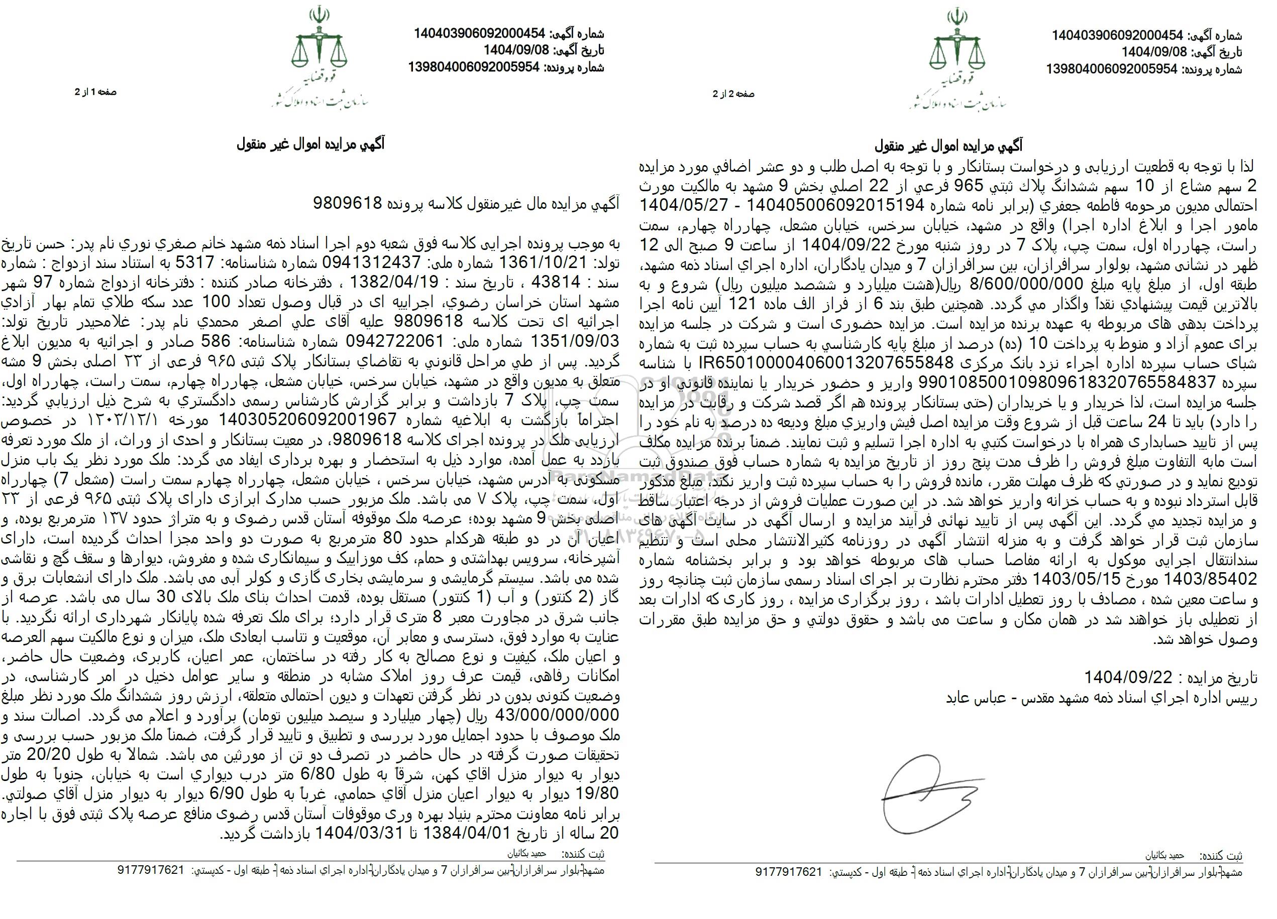 آگهی مزایده مال غیر منقول کلاسه پرونده 9809618