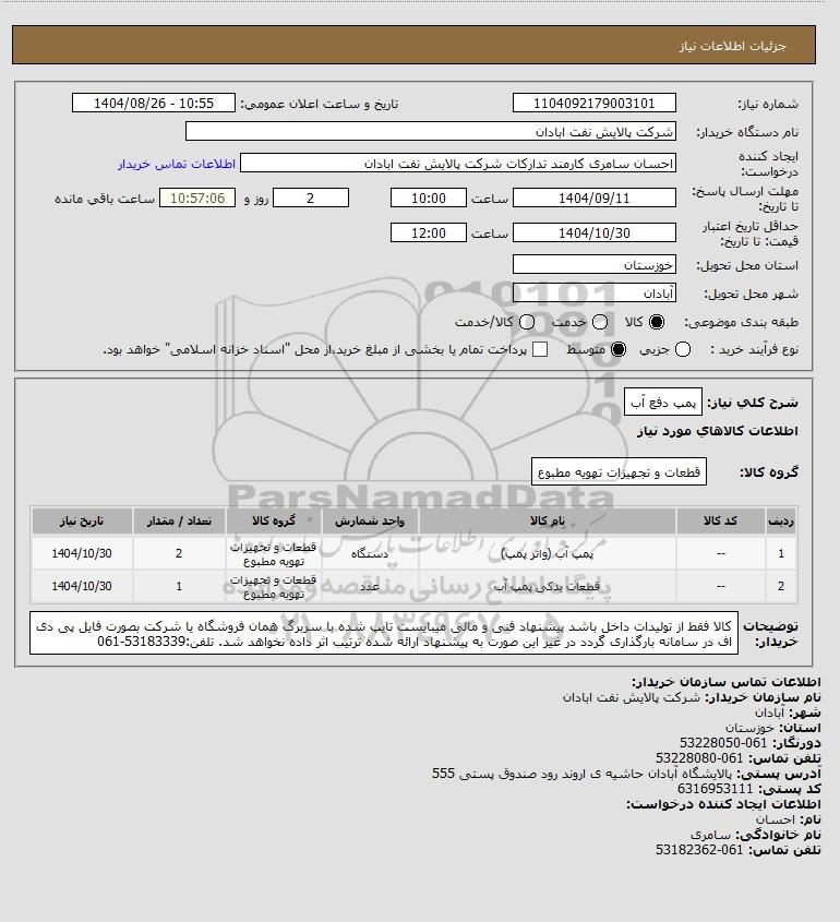 | 2 | -- | قطعات یدکی پمپ آب | عدد | قطعات و تجهیزات تهویه مطبوع | 1 | 1404/10/30 |