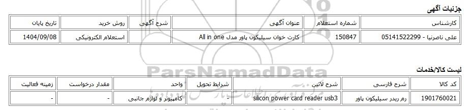 | علی ناصرنیا - 05141522299 | 150847 | کارت خوان سیلیکون پاور مدل All in one | استعلام الکترونیکی | 1404/09/08 |