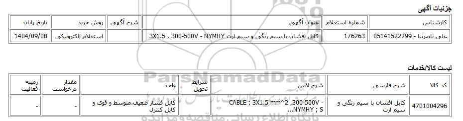 | علی ناصرنیا - 05141522299 | 176263 | کابل افشان با سیم رنگی و سیم ارت 3X1.5 , 300-500V - NYMHY | استعلام الکترونیکی | 1404/09/08 |