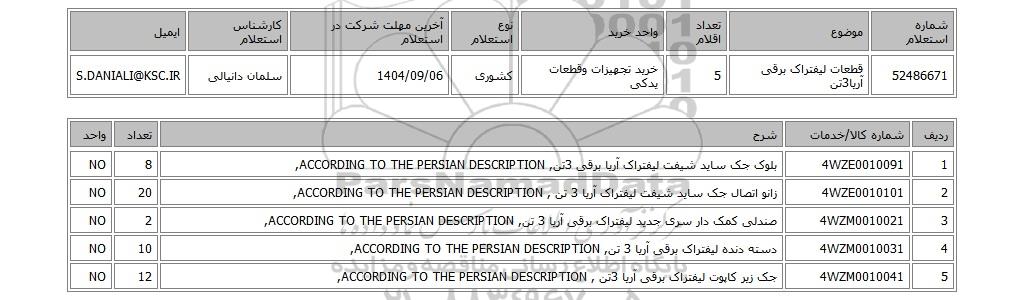 | 52486671 | قطعات لیفتراک برقی آریا3تن | 5 | خرید تجهیزات وقطعات یدکی | کشوری | 1404/09/06 | سلمان دانیالی | S.DANIALI@KSC.IR |