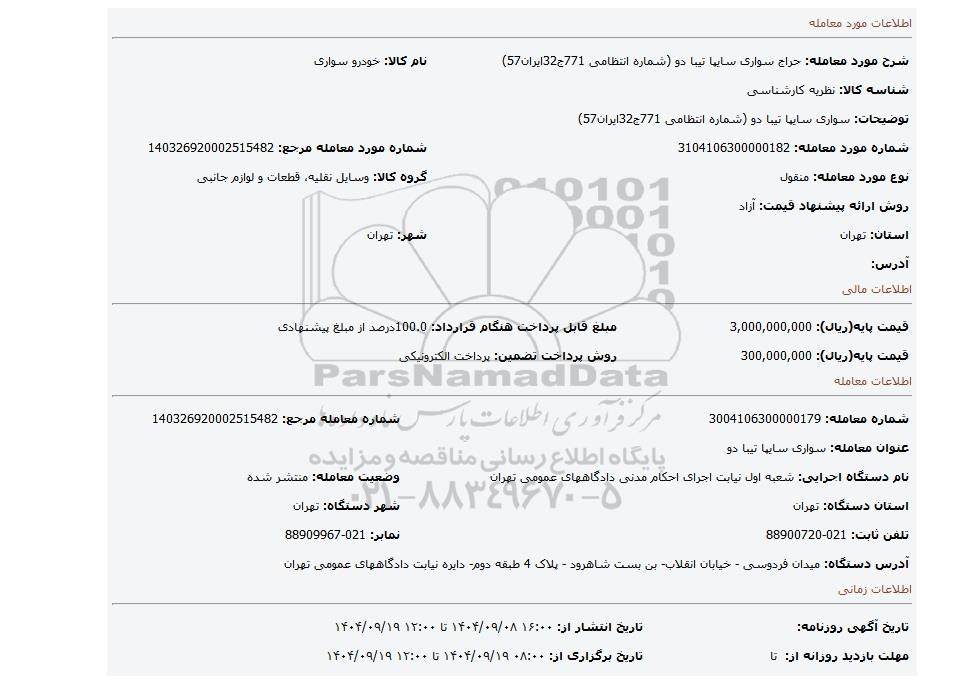 | شرح مورد معامله: حراج سواری سایپا تیبا دو (شماره انتظامی 771ج32ایران57) | نام کالا: خودرو سواری | |