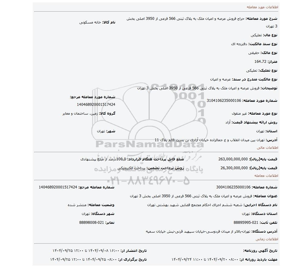 | عنوان معامله: فروش عرصه و اعیان ملک به پلاک ثبتی 566 فرعی از 3950 اصلی بخش 3 تهران | ||