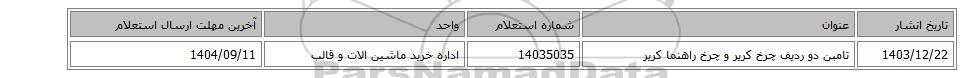 | 1403/12/22 | تامبن دو ردیف چرخ کریر و چرخ راهنما کریر | 14035035 | اداره خرید ماشین الات و قالب | 1404/09/11 |
