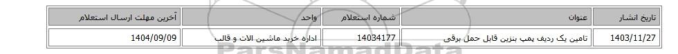 استعلام بها و موضوع استعلام استعلام، تامین یک ردیف پمپ بنزین قابل حمل برقی به اطلاع کلیه شرکتها و افراد متخصص واجد شرایط میرساند، آگهی گذار در نظر دارد از طریق استعلام بها، نسبت به انتخاب و دریافت پیشنهادات اقدام نماید. این استعلام با کد آگهی ثبت شده در سامانه خبرگزاری پارس نماد : 9918144 منتشر شده است. مشخصات استعلام : تاریخ شروع استعلام: 1404/09/09 آخرین مهلت ارسال پیشنهاد قیمت : 1404/09/09 و محل اجرای پروژه : استان تهران میباشد. استعلام قیمت مورد درخواست : استعلام، تامین یک ردیف پمپ بنزین قابل حمل برقی با دستهبندیهای تخصصی و گروه های مرتبط : تجهیزات و ماشین آلات صنعتی, تجهیزات و احداث جایگاه سوخت, قطعات خودرو, استعلام اطلاع رسانی میگردد.