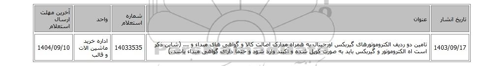| 1403/09/17 | تامین دو ردیف الکتروموتورهای گیربکس اورجینال به همراه مدارک اصالت کالا و گواهی های مبداء و ... (شاین ذکر است اه الکتروموتور و گیربکس باید به صورت کوپل شده و آکبند وارد شود و حتمآ دارای گواهی مبداء باشد.) | 14033535 | اداره خرید ماشین الات و قالب | 1404/09/10 |