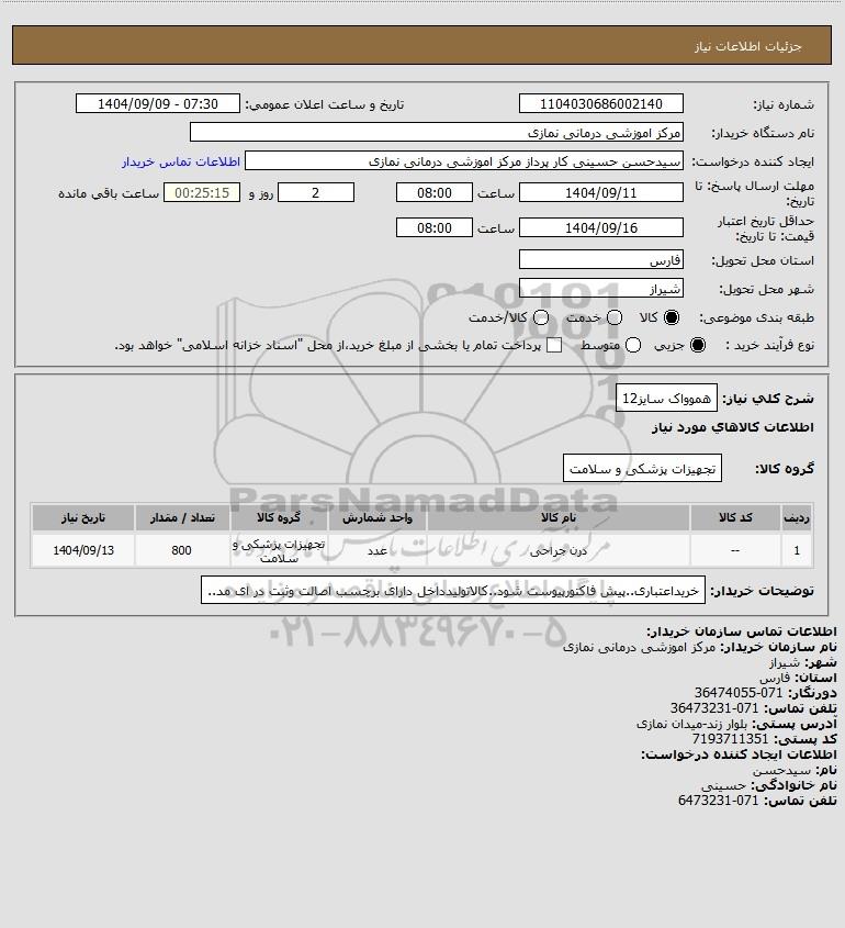 | 1 | -- | درن جراحی | عدد | تجهیزات پزشکی و سلامت | 800 | 1404/09/13 |