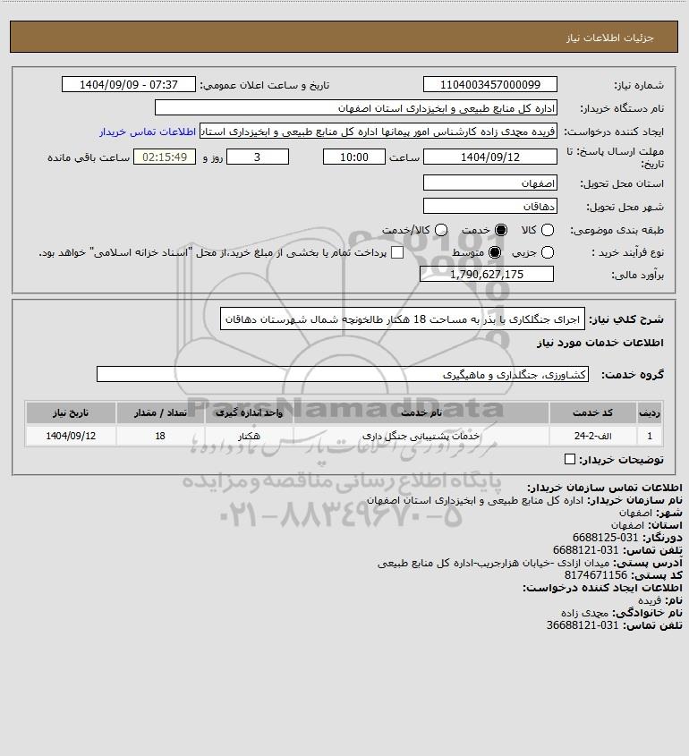 شرح کلی نیاز: اجرای جنگلکاری با بذر به مساحت 18 هکتار طالخونچه شمال شهرستان دهاقان