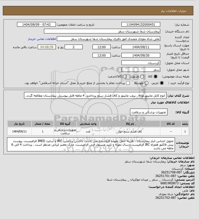 | 1 | -- | کاف فشار سنج خون | عدد | تجهیزات پزشکی و سلامت | 1 | 1404/09/11 |