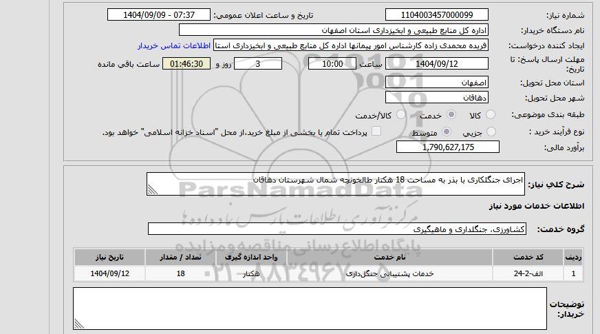 شرح کلی نیاز: اجرای جنگلکاری با بذر به مساحت 18 هکتار طالخونچه شمال شهرستان دهاقان