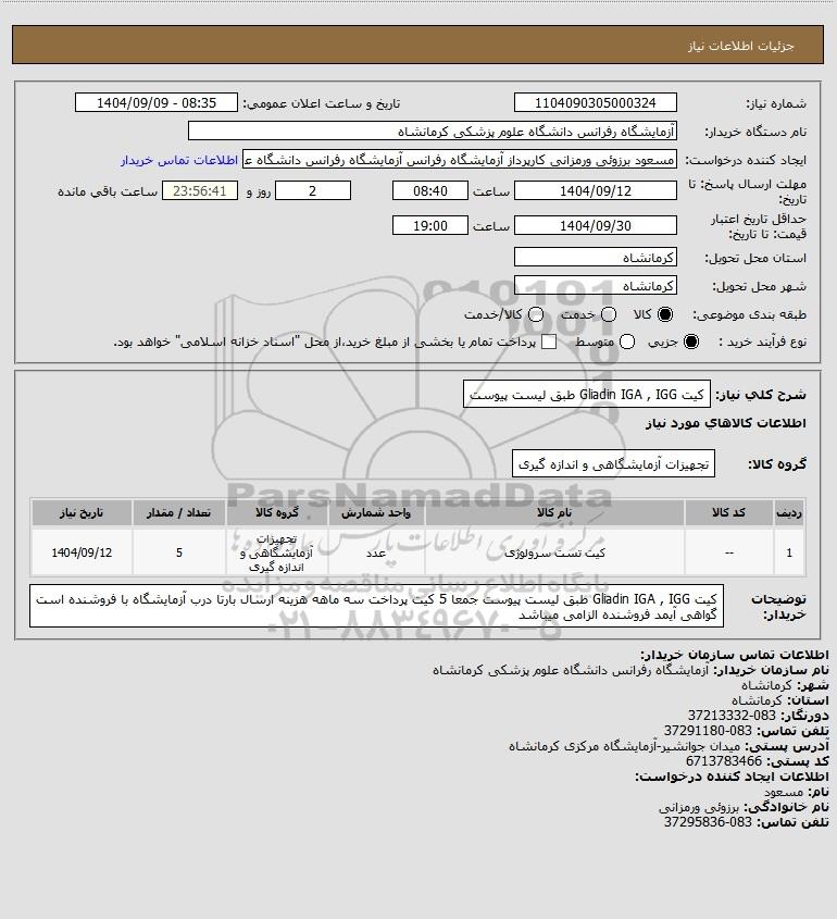 | 1 | -- | کیت تست سرولوژی | عدد | تجهیزات آزمایشگاهی و اندازه گیری | 5 | 1404/09/12 |