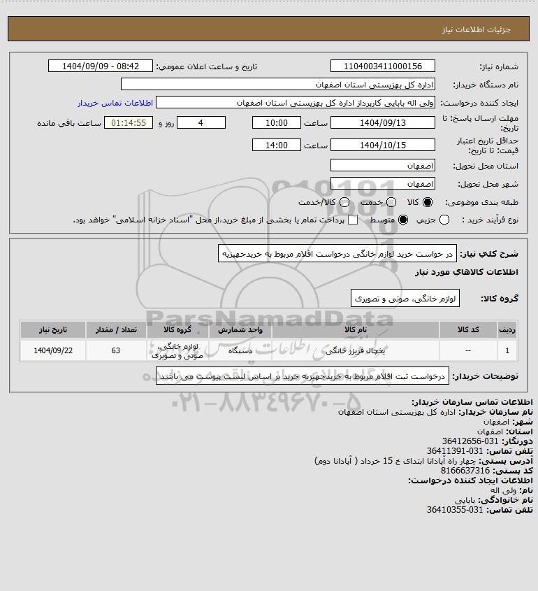 شرح کلی نیاز: در خواست خرید لوازم خانگی