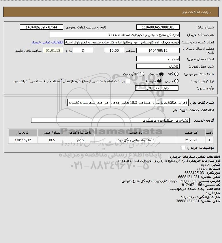 شرح کلی نیاز: اجرای جنگلکاری با بذر به مساحت 18.5 هکتار رودخانه میر حیدر شهرستان کاشان