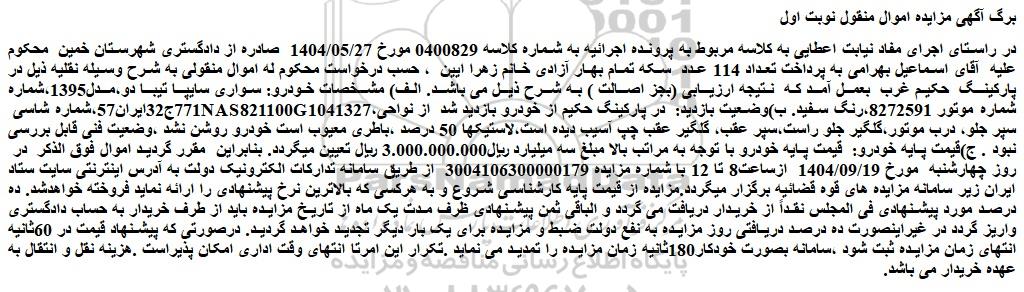 در راستای اجرای مفاد نیابت اعطایی به کلاسه مربوط به پرونده اجرائیه به شماره کلاسه 0400829 مورخ 1404/05/27 صادره از دادگستری شهرستان خمین محکوم علیه آقای اسماعیل بهرامی به پرداخت تعداد 114 عدد سکه تمام بهار آزادی خانم زهرا ایین ، حسب درخواست محکوم له اموال منقولی به شرح وسیله نقلیه ذیل در پارکینگ حکیم غرب بعمل آمد که نتیجه ارزیابی (بجز اصالت ) به شرح ذیل می باشد. الف) مشخصات خودرو: سواری سایپا تیبا دو،مدل1395،شماره 771ج32ایران57،شماره شاسی nas821100g1041327،شماره موتور 8272591،رنگ سفید. ب)وضعیت بازدید: در پارکینگ حکیم از خودرو بازدید شد از نواحی سپر جلو، درب موتور،گلگیر جلو راست،سپر عقب، گلگیر عقب چپ آسیب دیده است،لاستیکها 50 درصد ،باطری معیوب است خودرو روشن نشد ،وضعیت فنی قابل بررسی نبود . ج)قیمت پایه خودرو: قیمت پایه خودرو با توجه به مراتب بالا مبلغ سه میلیارد ریال3.000.000.000 ریال تعیین میگردد. بنابراین مقرر گردید اموال فوق الذکر در روز چهارشنبه مورخ 1404/09/19 ازساعت8 تا 12 با شماره مزایده 3004106300000179 از طریق سامانه تدارکات الکترونیک دولت به آدرس اینترنتی سایت ستاد ایران زیر سامانه مزایده های قوه قضائیه برگزار میگردد.مزایده از قیمت پایه کارشناسی شروع و به هرکسی که بالاترین نرخ پیشنهادی را ارائه نماید فروخته خواهدشد. ده درصد مورد پیشنهادی فی المجلس نقداً از خریدار دریافت می گردد و الباقی ثمن پیشنهادی ظرف مدت یک ماه از تاریخ مزایده باید از طرف خریدار به حساب دادگستری واریز گردد در غیراینصورت ده درصد دریافتی روز مزایده به نفع دولت ضبط و مزایده برای یک بار دیگر تجدید خواهد گردید. درصورتی که پیشنهاد قیمت در 60ثانیه انتهای زمان مزایده ثبت شود ،سامانه بصورت خودکار180ثانیه زمان مزایده را تمدید می نماید .تکرار این امرتا انتهای وقت اداری امکان پذیراست .هزینه نقل و انتقال به عهده خریدار می باشد.