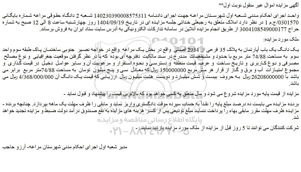 واحد اجرای احکام مدنی شعبه اول شهرستان مراغه جهت اجرای دادنامه 140230390008575311 شعبه 2 دادگاه حقوقی مراغه شماره بایگانی 0301570/ج.م 1 در نظر دارد املاک متعلق به رجبعلی خدائی جلسه مزایده ای در تاریخ 1404/09/19 روز چهارشنبه ساعت 8 الی 12 صبح به شماره حراج 3004108549000177 از طریق انجام مزایده آنلاین در سامانه تدارکات الکترونیکی به آدرس سایت ستاد ایران به فروش برساند.