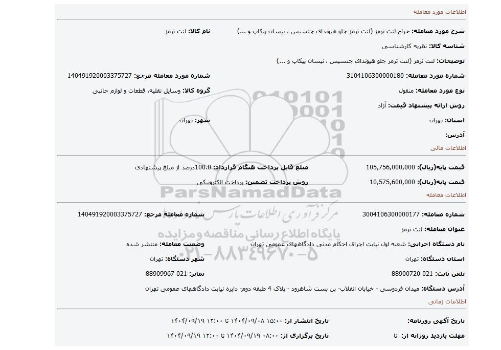 نام دستگاه اجرایی: شعبه اول نیابت اجرای احکام مدنی دادگاههای عمومی تهرانوضعیت معامله: منتشر شده